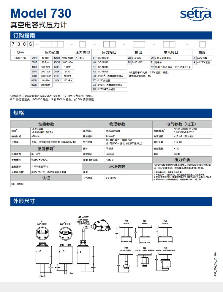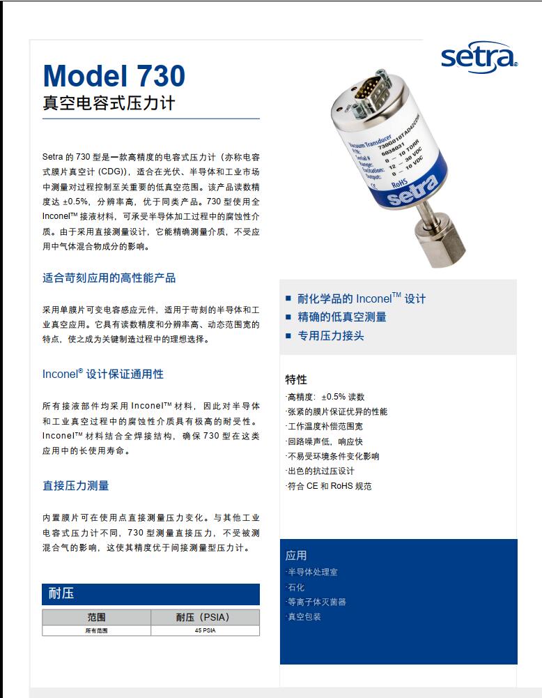 Setra的 730 型是一款高精度的电容式压力计(亦称电容式膜片真空计 (CDG)),适合在光伏、半导体和工业市场中测量对过程控制至关重要的低真空范围。该产品读数精度达 ±0.5%,分辨率高,优于同类产品。 730 型使用全InconelTM 接液材料,可承受半导体加工过程中的腐蚀性介